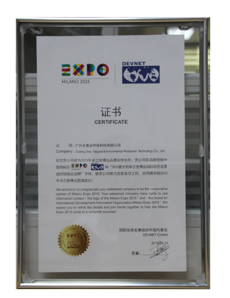 米蘭世博會、國際信息發展組織授權太氧谷品牌證書