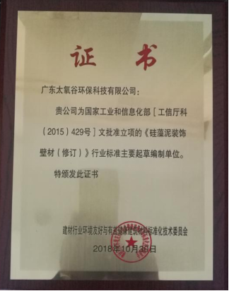 據了解,”生態綠色建材產品“的評審尤為苛刻,要求無論在生產、使用和再循環過程中都要做到零污染,不能對環境以及消費者造成任何不良影響。硅藻泥產品的環保性能是評審的首要標準,而作為硅藻泥壁材行業標準主要起草編制單位的太氧谷硅藻泥的主要原料硅藻土添加多種無機礦物原料配方而成,產品配方環無污染無甲醛,環保級別達到了最高標準。